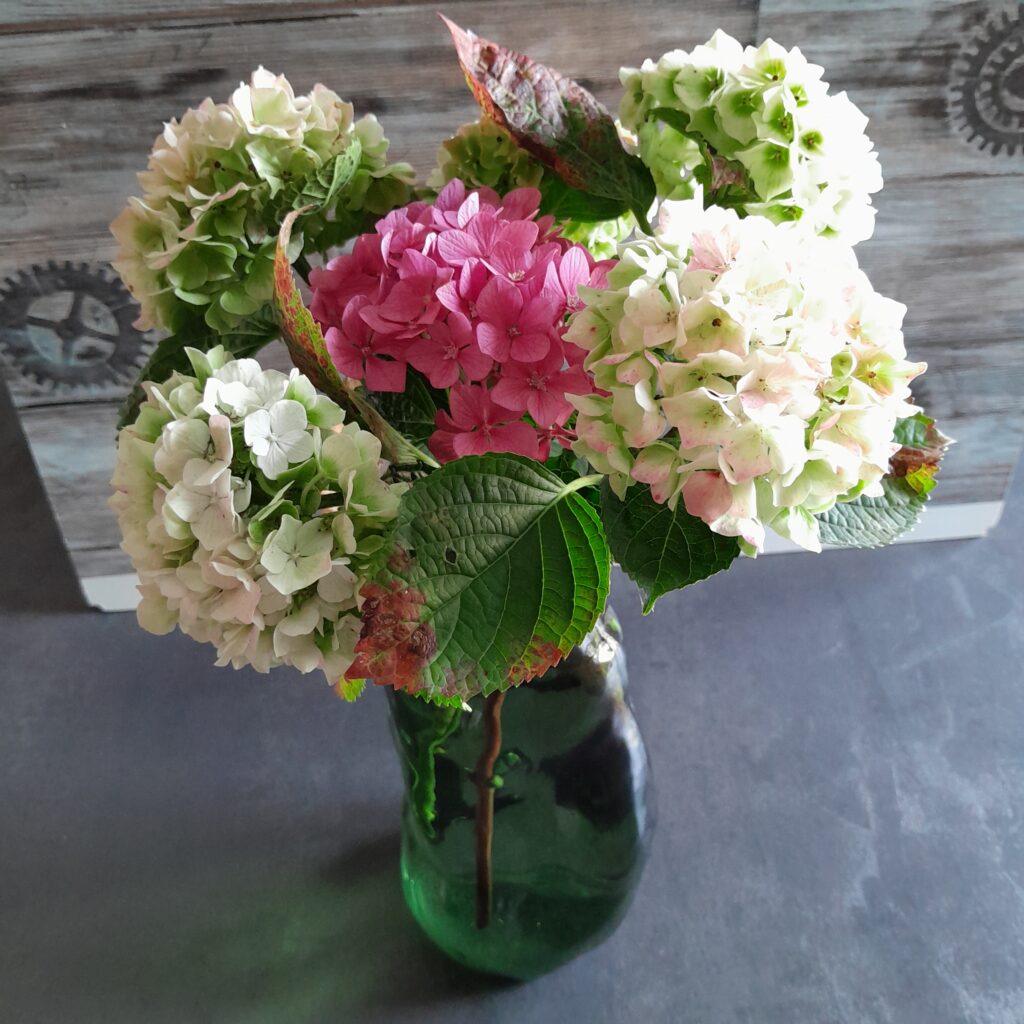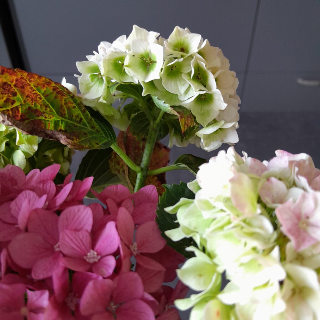 JP, hortensia boule tout simple d’une jolie couleur « rose frais », prenait ses aises dans le jardin clos d’une très ancienne maison de ville, restaurée par des amis. Le rose étant une de mes couleurs préférées, je n’avais pas pu résister à l’envie de faire quelques boutures. Une seule avait prise (pas trop la main verte…), qui a du se contenter d’un pot pendant plusieurs années. Bien qu’à l’étroit, il a fleuri tous les ans, me gratifiant même d’un feuillage coloré en Automne, acceptant stoïquement les oublis d’arrosage qui le laissaient quelque peu « fla-fla ». N’ayant pas le nom de la variété je l’avais baptisé JP, prénom du copain.