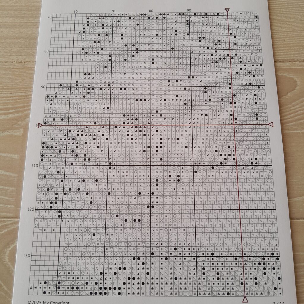 Ce que je n’avais pas anticipé, c’est la difficulté à broder un grand motif avec de très nombreux dégradés, et que se repérer sur une couleur spécifique pour calculer et broder des points allait être compliqué. Pour la 1ère fois, renseignements pris sur internet, j’ai quadrillé avec un fil spécial qui théoriquement s’en va facilement quelques blocs sur ma toile, et cela m’aide bien. Et puis la grille est claire et les symboles bien expliqués. Malgré tout, cette broderie reste compliquée, le fil ne fait pas tout, l’enchevêtrement des couleurs implique de compter en permanence, et il est rare de faire plus de trois points d’affilé d’un même ton :